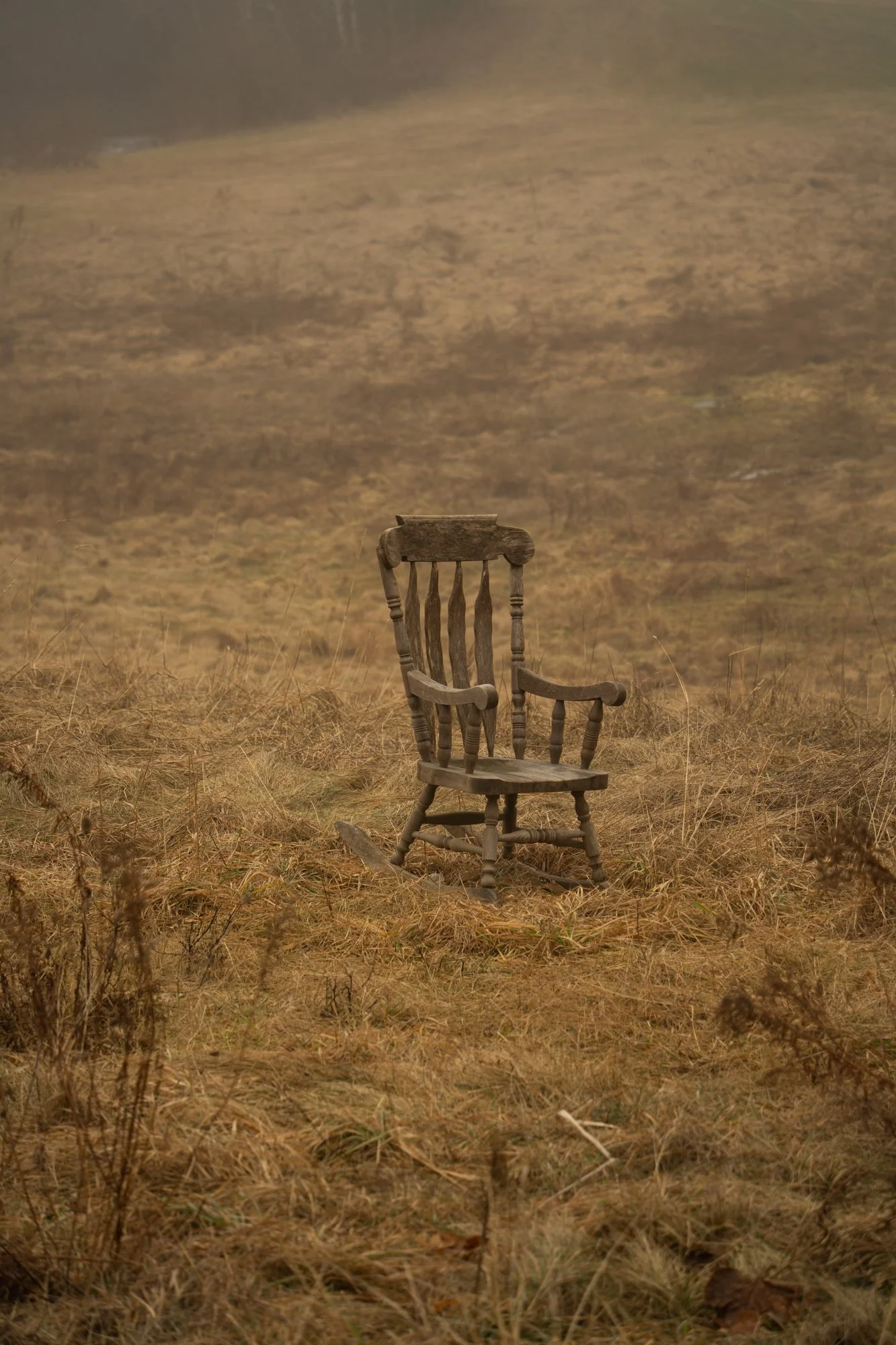 This photoshoot was an intimate exploration into the depths of grief, that would be paired with a thought-provoking article to amplify the narrative. The visual landscape was intentionally infused with dark and moody colors to evoke the profound emotions tied to pain and loss, while a fog-laden day was selected for the shoot, enveloping the scene in a veil of mystery that mirrors the often enigmatic nature of how grief intertwines with our lives. At the heart of this visual journey was a rugged wooden rocking chair, chosen as a poignant focal point; its weathered surface and worn edges served as a powerful symbol of the long-lasting effects that grief imprints on our souls over time, allowing the overall composition to resonate deeply with viewers and inviting them to confront their own experiences with sorrow in a raw and reflective manner.