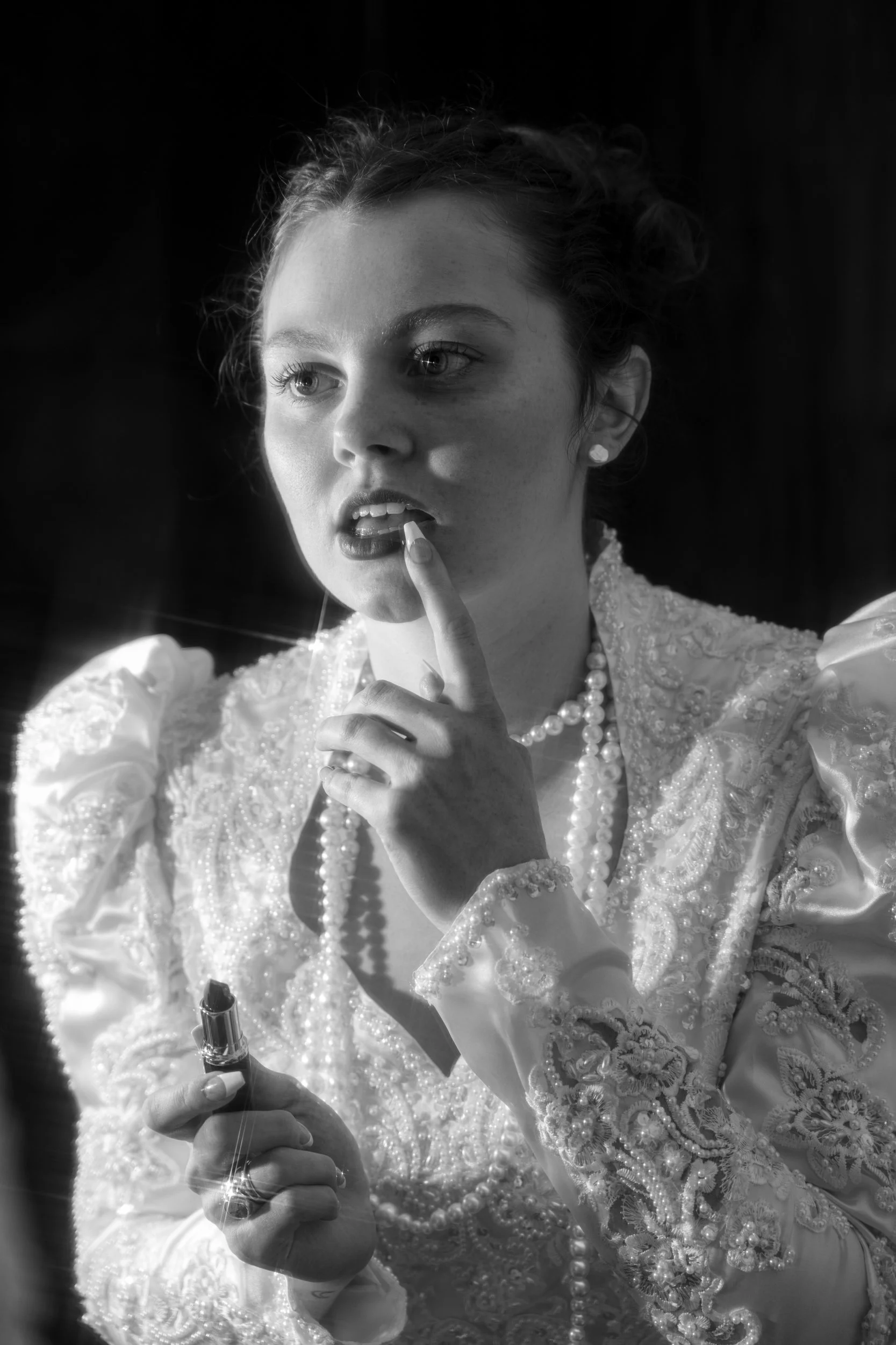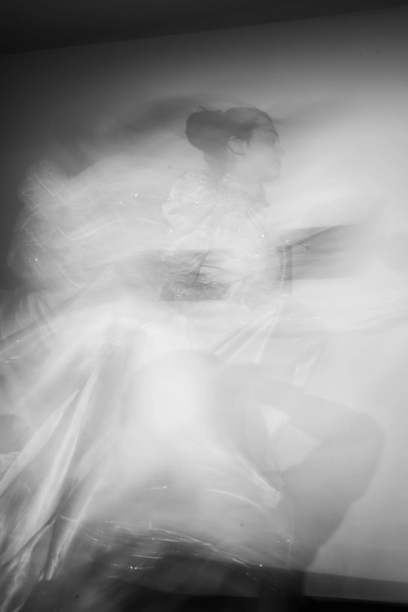 This photo shoot tells the story of a bride making a dramatic escape from the altar, captured in striking black and white to evoke timelessness and nostalgia. Adorned in a stunning vintage wedding dress and a handmade string of pearls, her understated makeup features a bold lip that symbolizes her fierce determination. Motion blur techniques enhance the urgency of her flight, allowing viewers to feel the tension and emotion in her escape. This powerful visual narrative invites contemplation about love, freedom, and the choices we make.